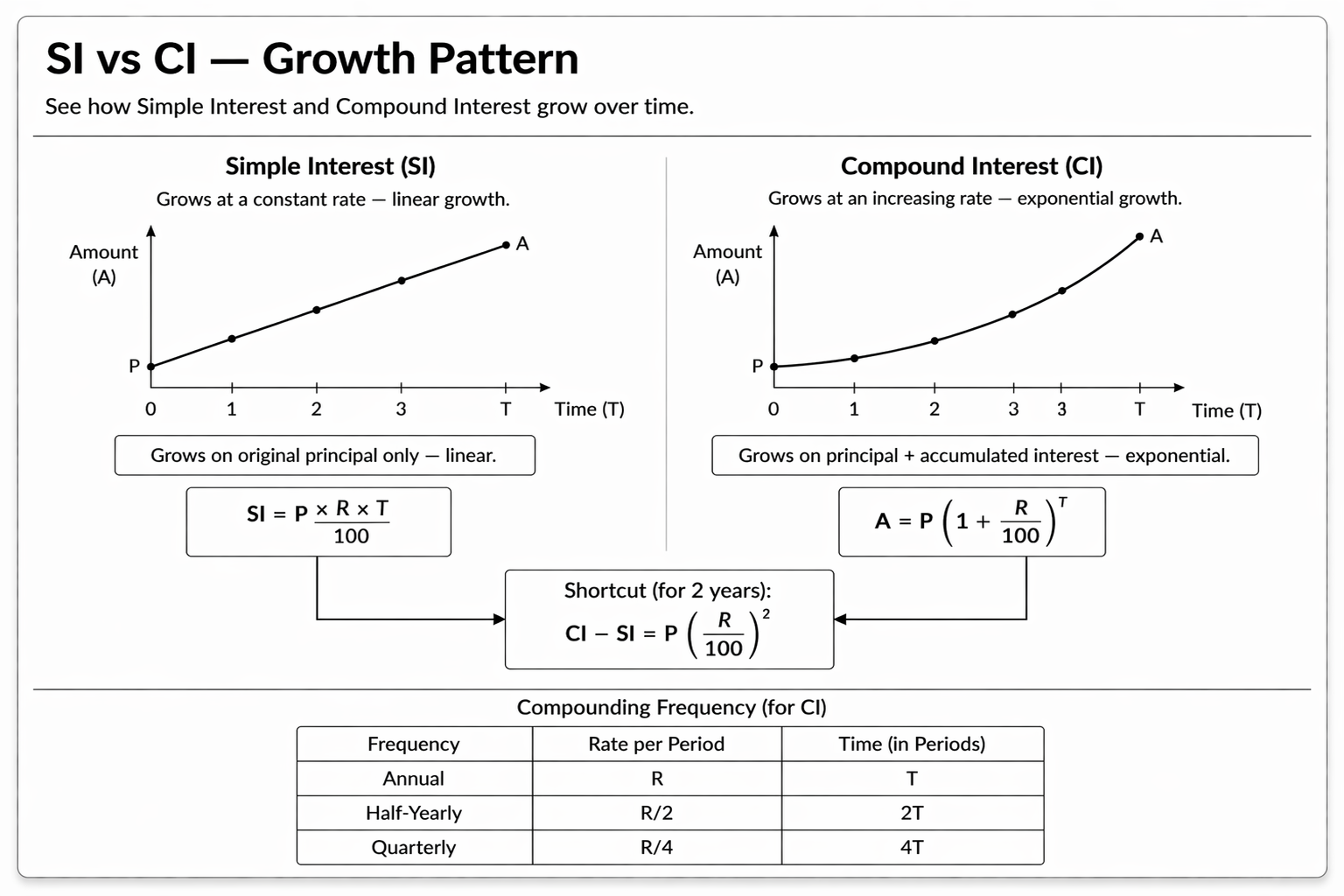 In placement tests, always read carefully for the phrases compounded annually, half-yearly, or quarterly before applying the CI formula. The 2-year shortcut for the difference between CI and SI saves at least 30 seconds per problem. Using the SI formula when CI is asked is the most common and costly mistake in this topic.