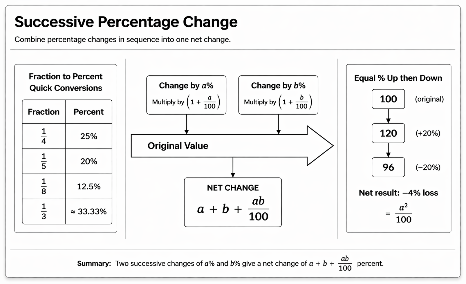 If a value changes by a percent and then by b percent, the net percentage change equals a plus b plus ab divided by 100. When one change is positive and the other negative — for example, a 20 percent increase followed by a 20 percent decrease — the net result is never zero. It is always a loss of a squared divided by 100 percent.