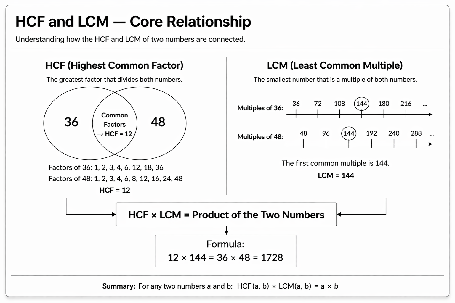 HCF of two numbers is the largest number that divides both of them exactly. LCM of two numbers is the smallest number that is exactly divisible by both. The most important relationship connecting them is: HCF multiplied by LCM equals the product of the two numbers. This identity allows you to find one if the other and the product are known.