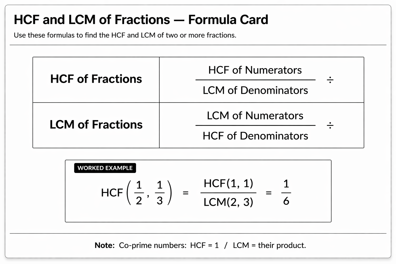 HCF of fractions equals HCF of numerators divided by LCM of denominators. LCM of fractions equals LCM of numerators divided by HCF of denominators. For consecutive integers n and n plus 1, HCF is always 1 and LCM equals their product. If two numbers are co-prime, their HCF is 1 and their LCM equals their product.