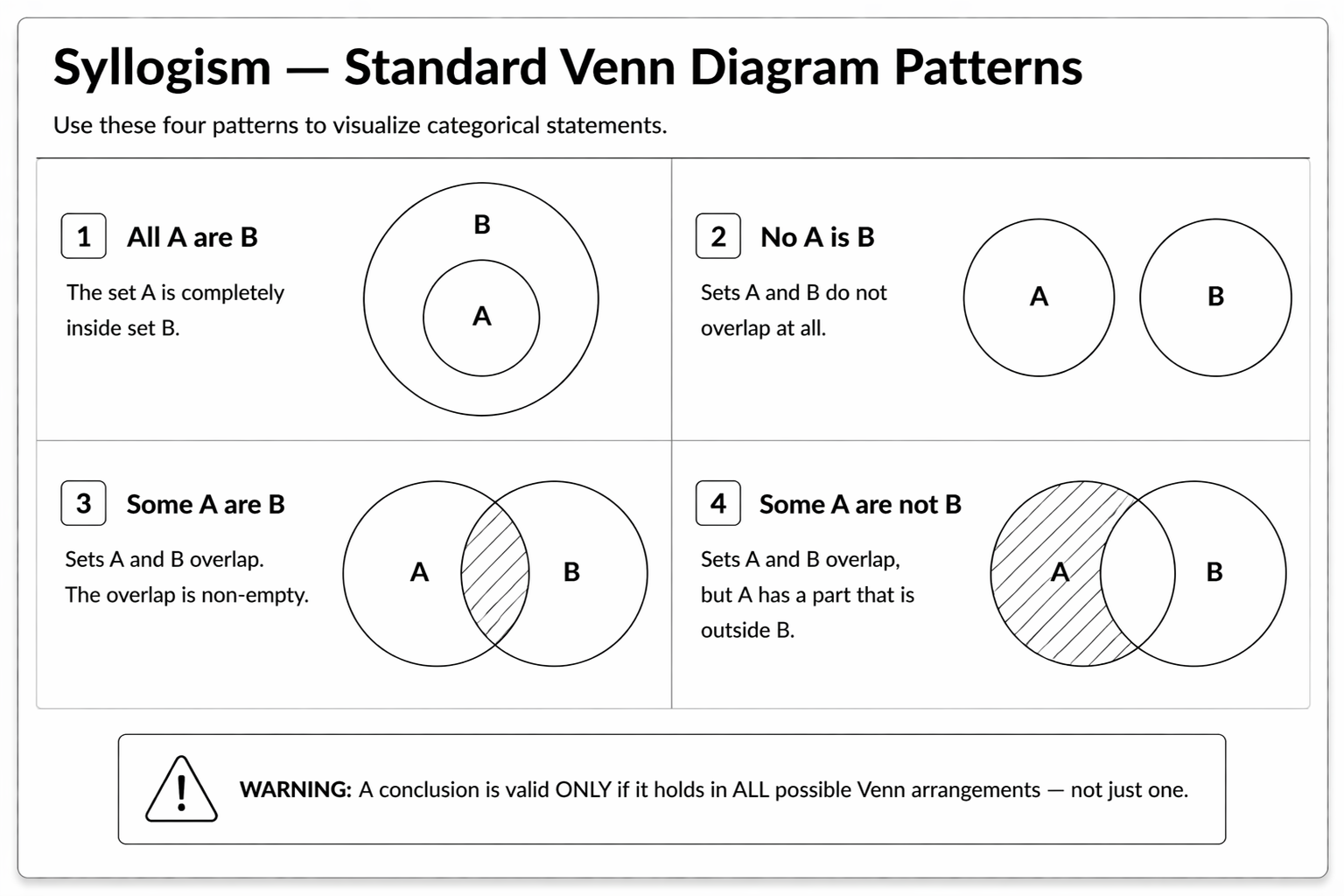 All A are B: draw A circle completely inside B circle. No A is B: draw A and B circles completely separate with no overlap. Some A are B: draw A and B circles partially overlapping. Some A are not B: part of A is drawn outside B. A conclusion is valid only if it is true in every possible Venn diagram arrangement consistent with the given statements, not just one possible arrangement.