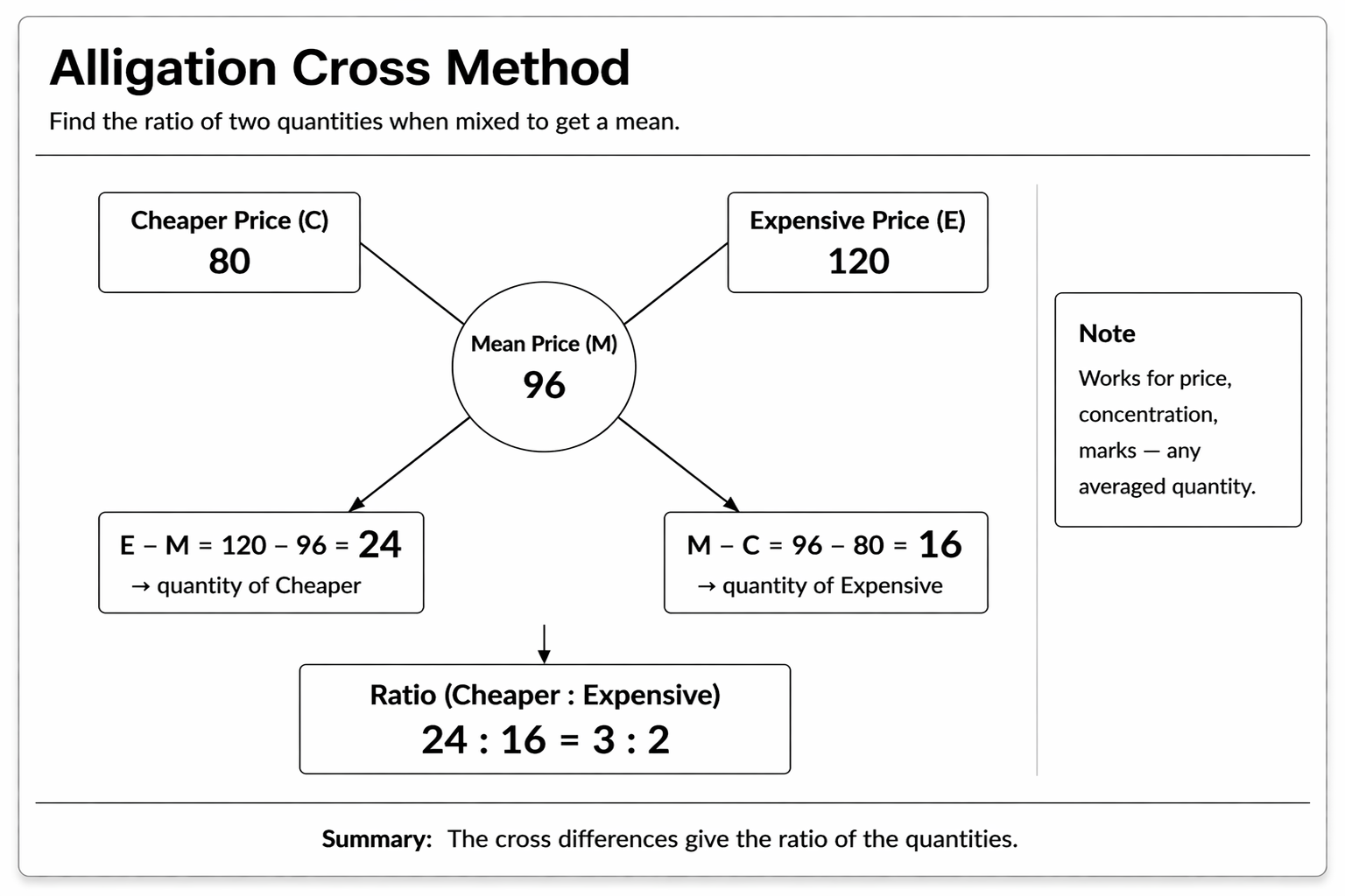 Draw a cross with the cheaper value on the left, the expensive value on the right, and the desired mean in the centre. Subtract diagonally: the left diagonal gives expensive minus mean, and the right diagonal gives mean minus cheaper. These two results form the ratio of cheaper to expensive in the required mixture. This visual method works for any mixing problem involving price, concentration, or any averaged quantity.
