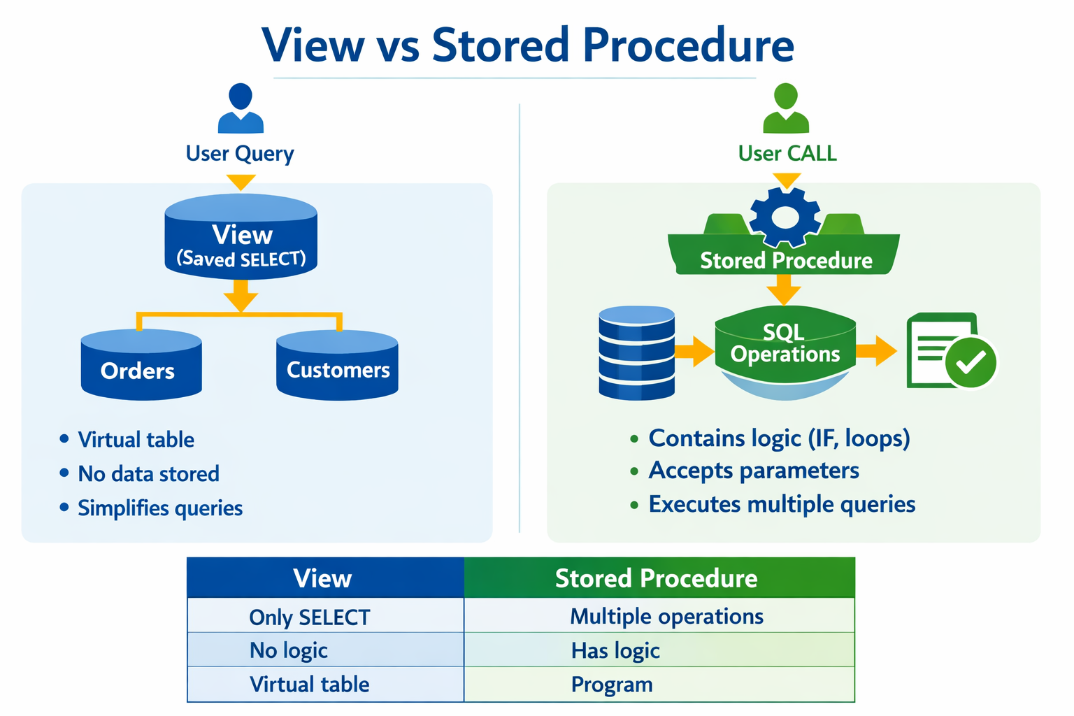 SQL VIEW, CREATE VIEW, stored procedures, PROCEDURE, parameters, view vs table, virtual table