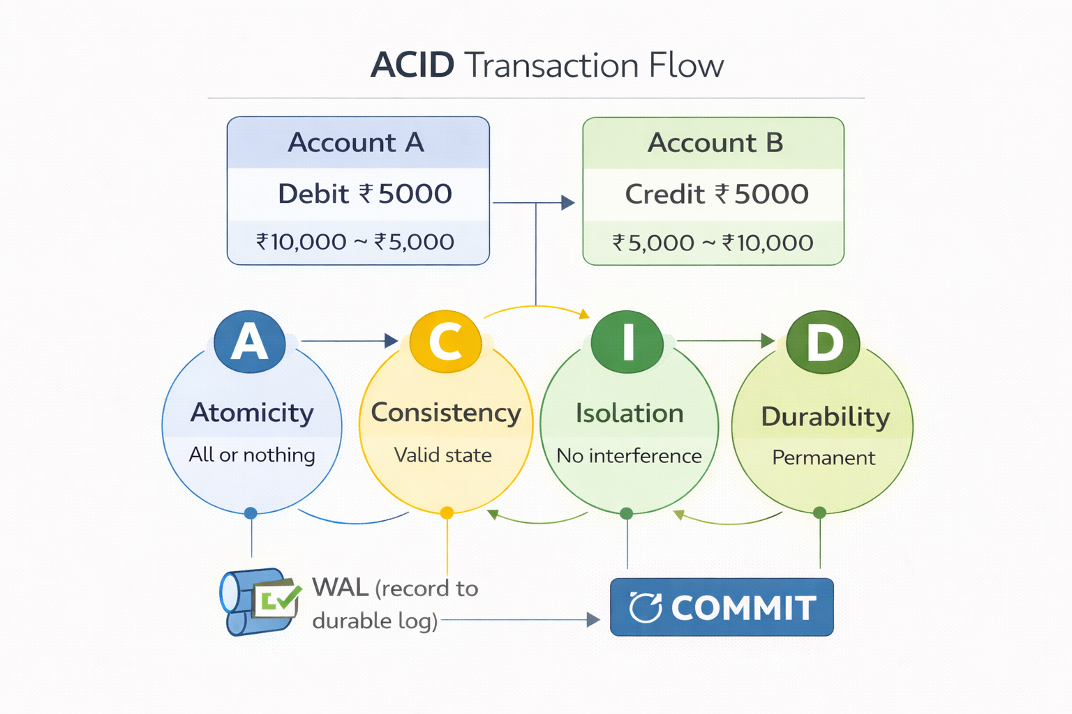 A transaction is a group of database operations that must either complete fully or not happen at all. It ensures that even if something goes wrong (like a crash or error), the database remains correct and reliable. This reliability is guaranteed by the ACID properties โ Atomicity, Consistency, Isolation, and Durability. ACID is what makes databases trustworthy for financial systems, medical records, and any application where data integrity is non-negotiable.