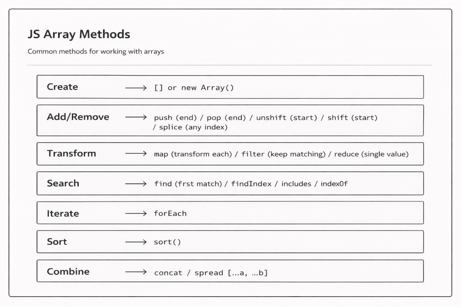 array creation, indexing, push, pop, shift, unshift, splice, slice, spread, Array methods: map, filter, reduce, find, forEach