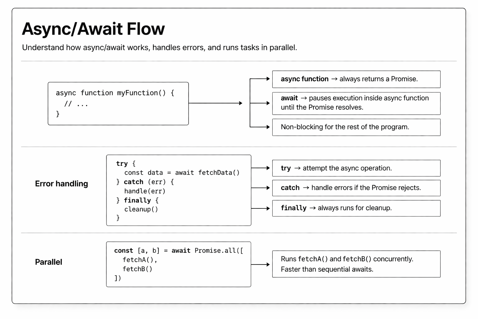 fetchUser(1).then(user => console.log(user));Error Handling with try/catch