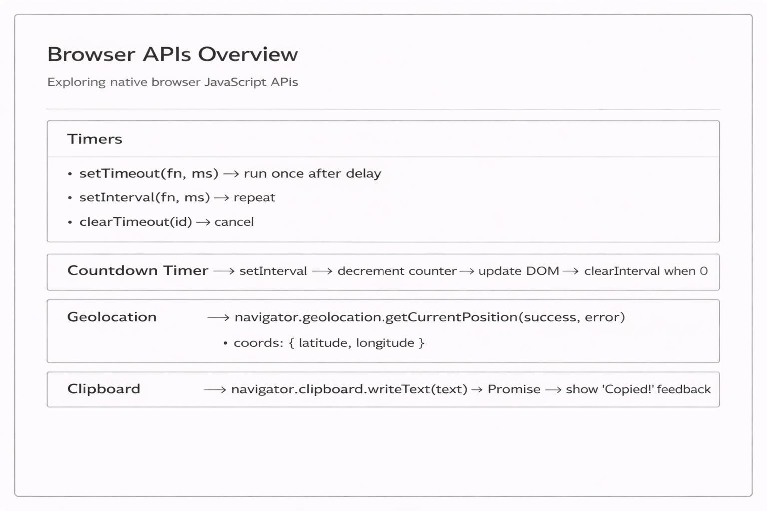 The browser exposes dozens of built-in APIs that JavaScript can use to interact with the device and environment. In this lesson we cover three important ones: timer functions for scheduling code, the Geolocation API for getting the user's location, and the Clipboard API for reading and writing text.