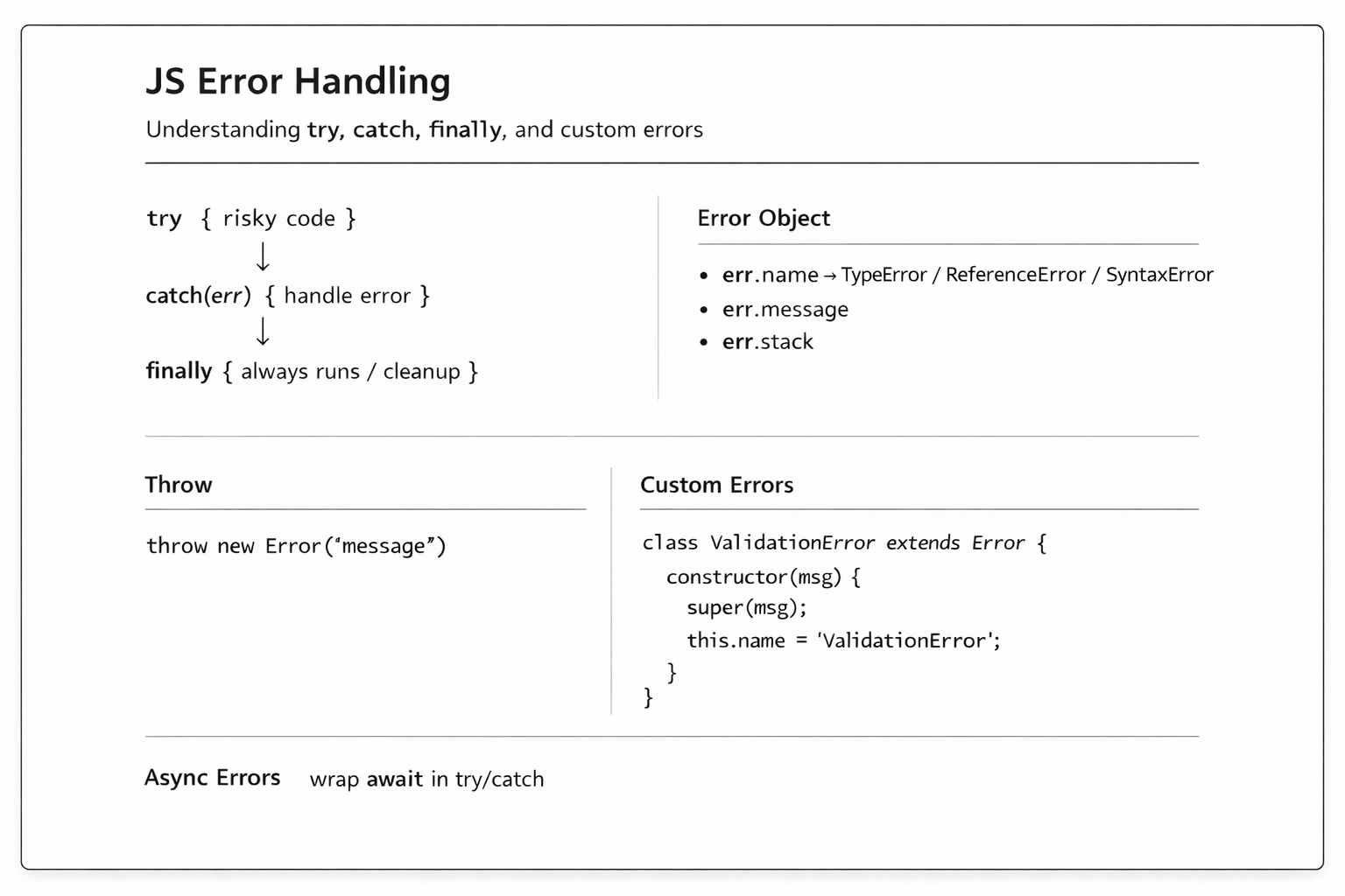 try/catch/finally, Error object, custom errors, throwing errors, error types, defensive programming
