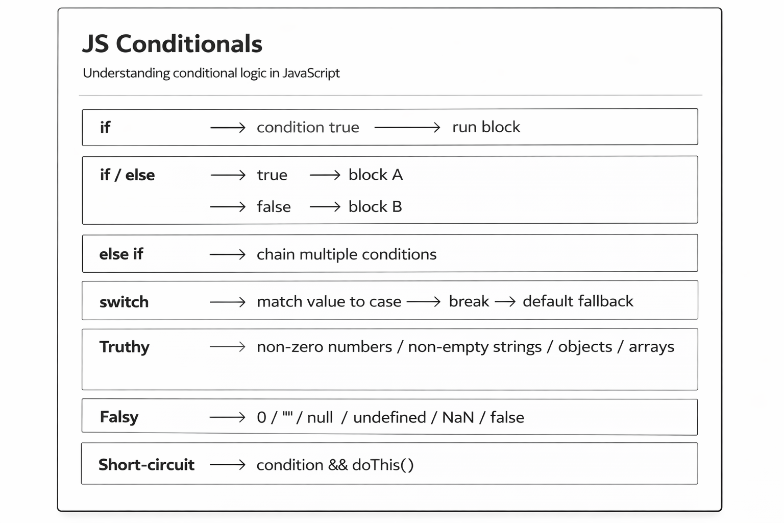 Conditional statements let your JavaScript program make decisions. Based on whether a condition is true or false, different blocks of code will run. This is the foundation of control flow โ the order in which code executes.