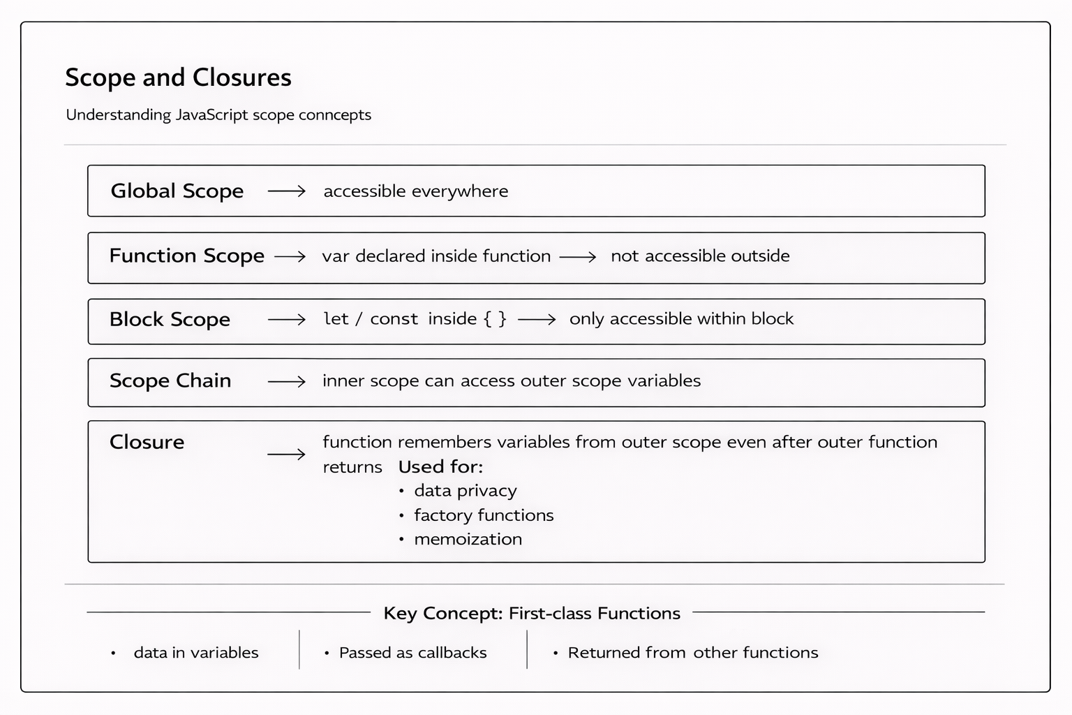 Scope determines where variables are accessible in your code. Closures are one of the most powerful and frequently misunderstood features in JavaScript. Once you understand them, you will see they appear everywhere โ in callbacks, event handlers, and many popular design patterns.