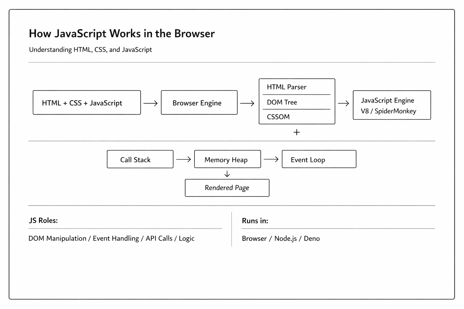 Every browser includes a JavaScript engine. Chrome and Node.js use V8, Firefox uses SpiderMonkey, and Safari uses JavaScriptCore. The engine reads your source code, parses it into an abstract syntax tree, compiles it to machine code using a just-in-time (JIT) compiler, and then executes it.