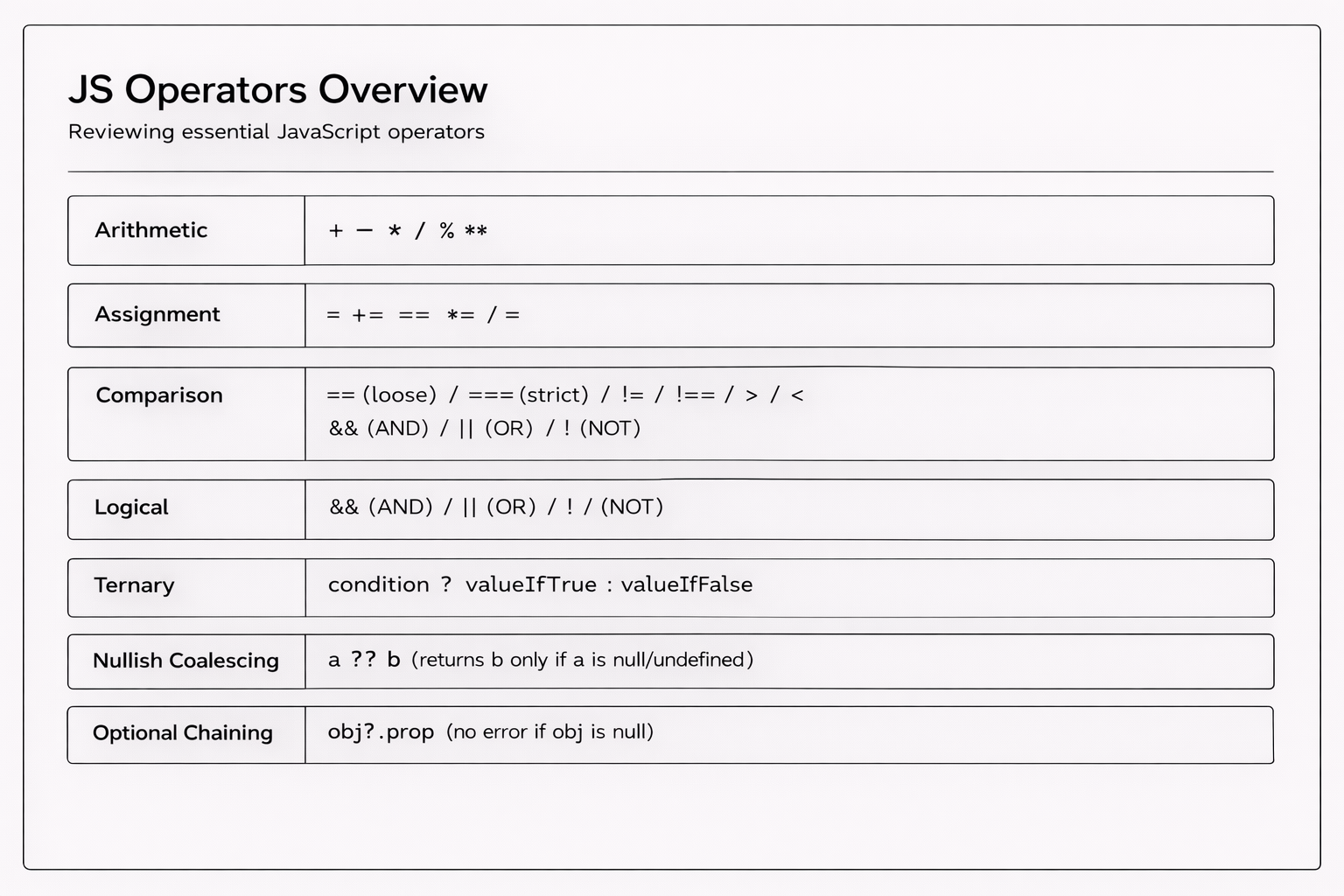 Operators are symbols that perform operations on values. JavaScript has a rich set of operators for arithmetic, comparisons, logical decisions, and more. Mastering operators is foundational to writing any meaningful JavaScript code.