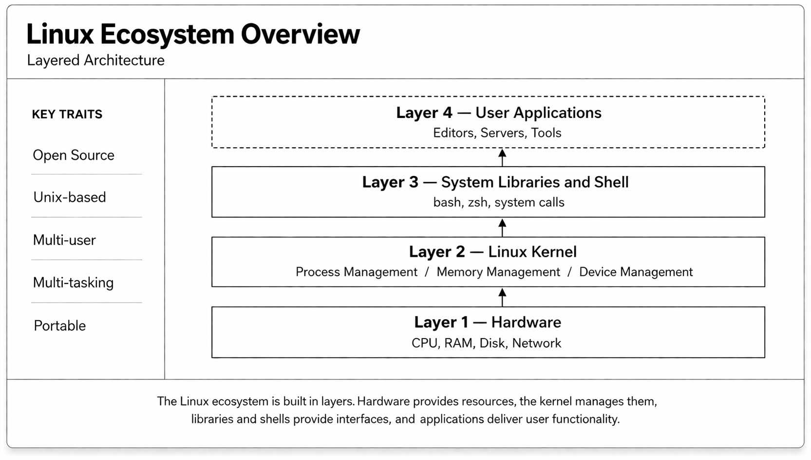 It is important to understand that Linux itself is technically just the kernel — the core component that manages hardware resources and allows software to run. What most people refer to as a Linux system is actually a complete operating system built on top of the kernel, often called a Linux distribution or distro, which includes the kernel, system tools, libraries, and a user interface.
