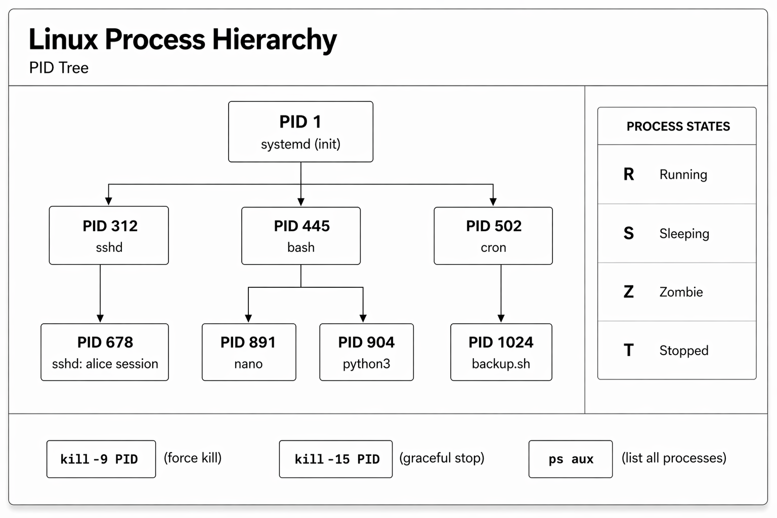 Every running program on a Linux system is a process. Each process has a unique process ID (PID), an owner, resource usage statistics, and a state. Understanding how to view, manage, and control processes is a critical Linux system administration skill covered in Linux basics courses and used daily in production environments.